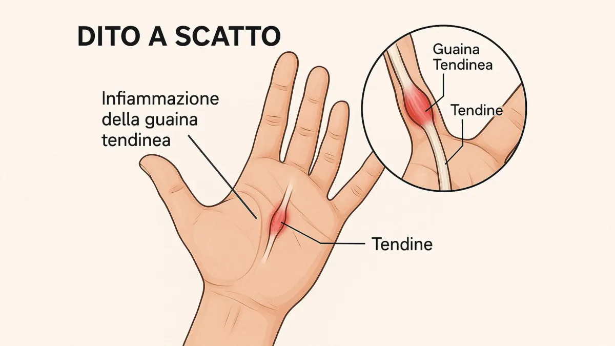 Il dito a scatto è causato dall’infiammazione della guaina tendinea, che rende difficile l’estensione del dito.