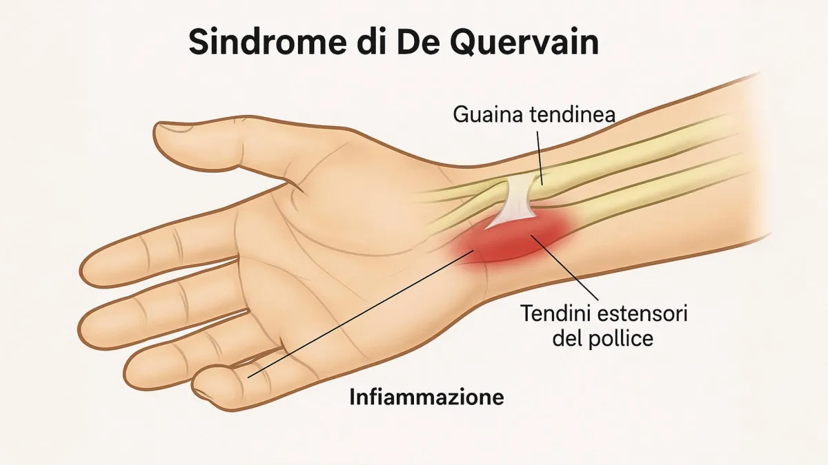 È un’infiammazione dei tendini estensori del pollice, che causa dolore sul lato del polso e difficoltà nei movimenti.