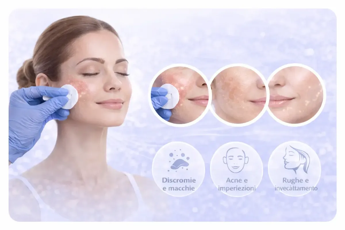 Il trattamento favorisce il ricambio cellulare, migliorando la texture cutanea, riducendo macchie e imperfezioni e rendendo la pelle più luminosa e uniforme.